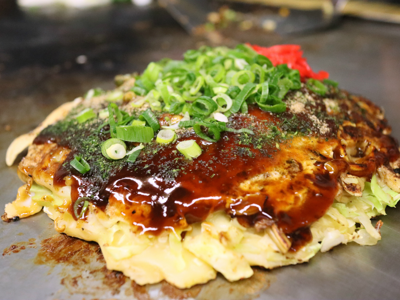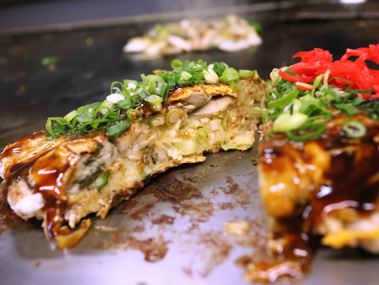 見た感じ、キャベツなどの具を混ぜ込んで焼いているので大阪風でしょうか。