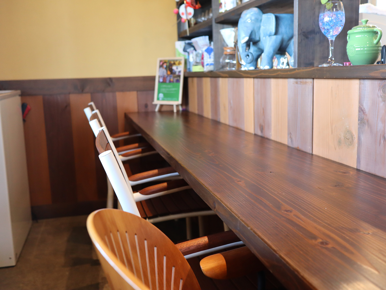 店内は、カウンター席が5席と、4人掛けのテーブルが2卓で8席。