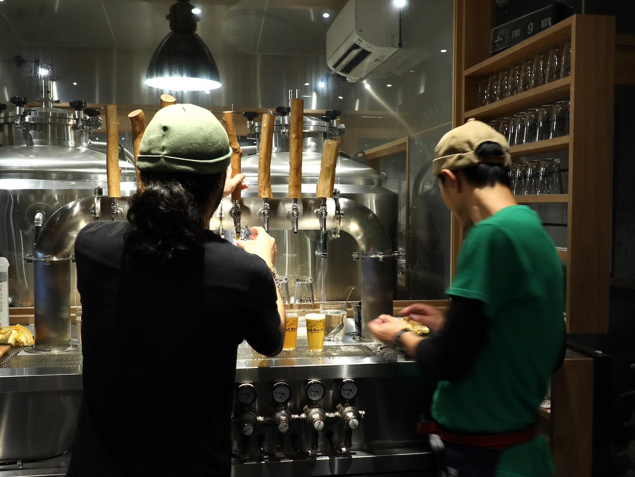 店内は、醸造所向きのカウンター席と、外側が見えるコの字型のカウンター席があり、