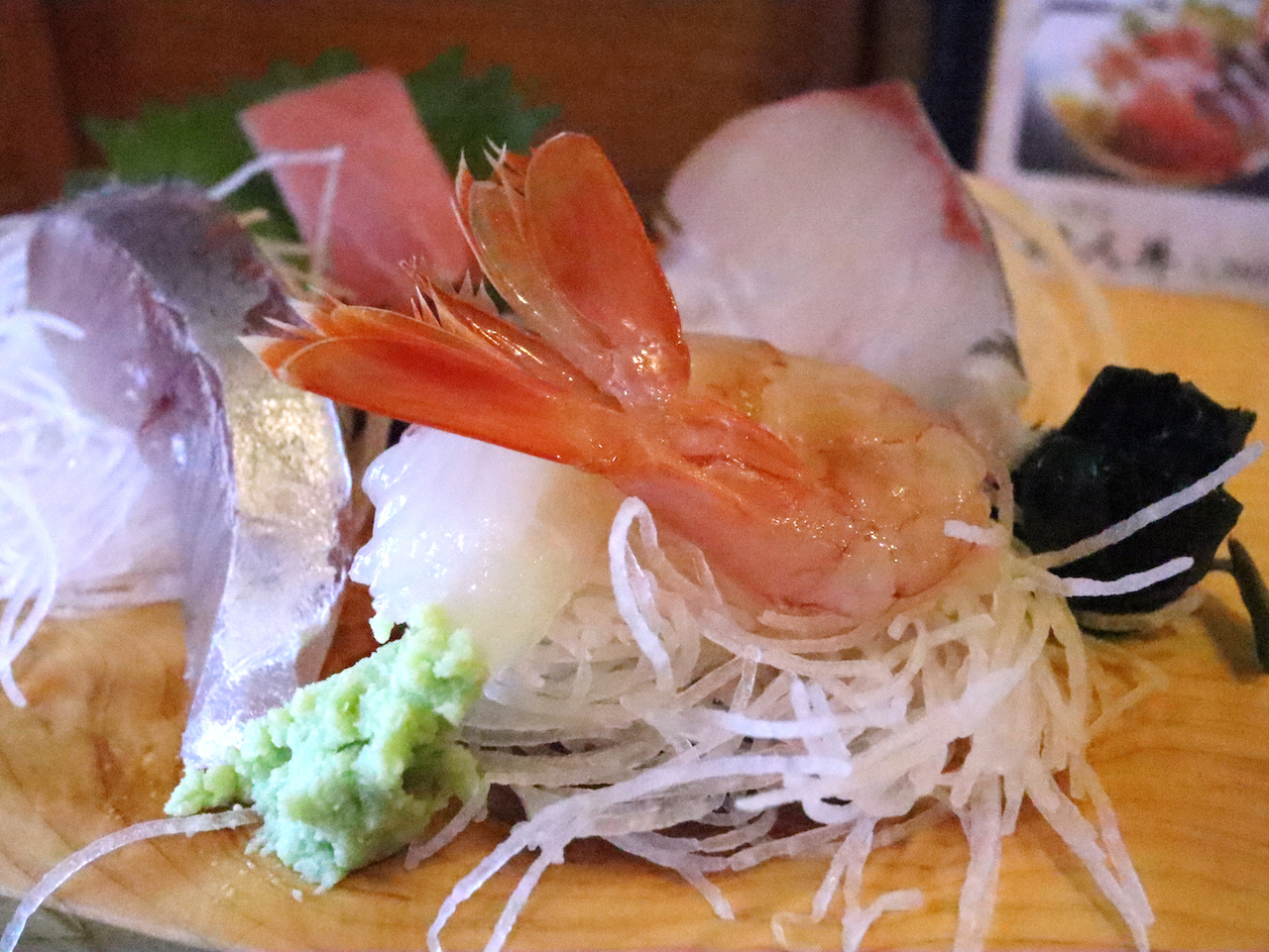 刺身4種と、大きなエビフライに、岩手県大船渡産の牡蠣。