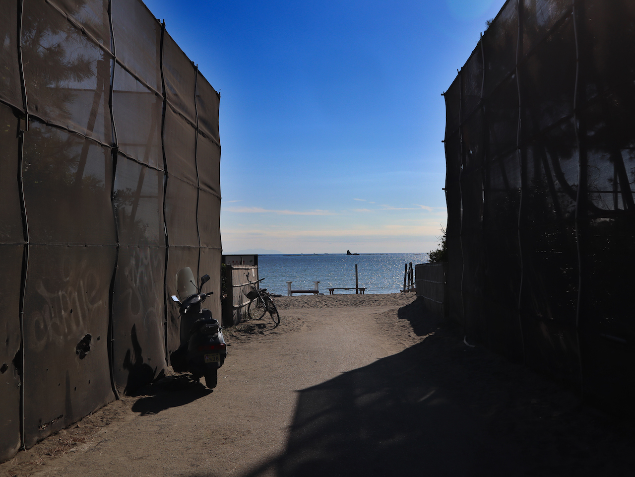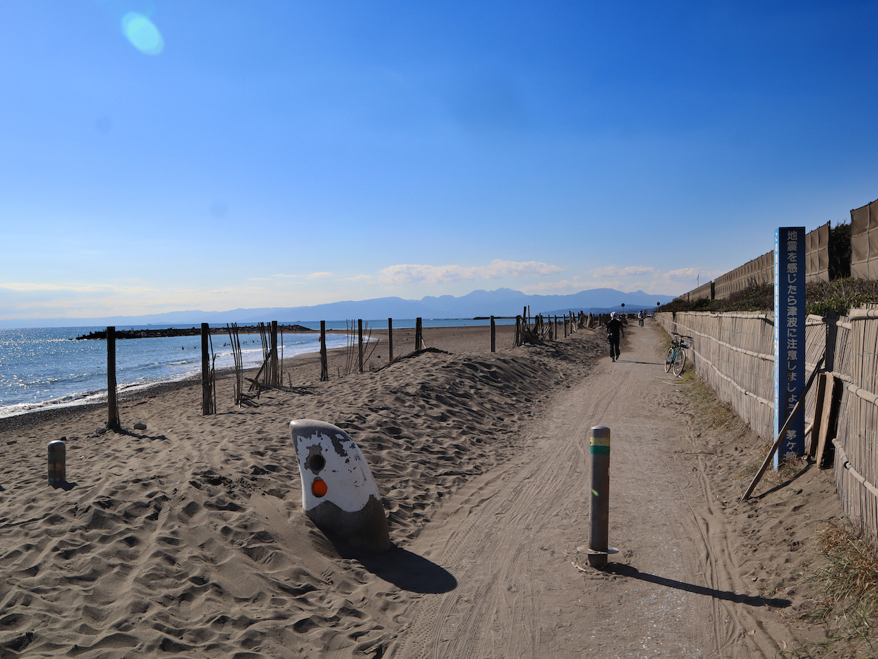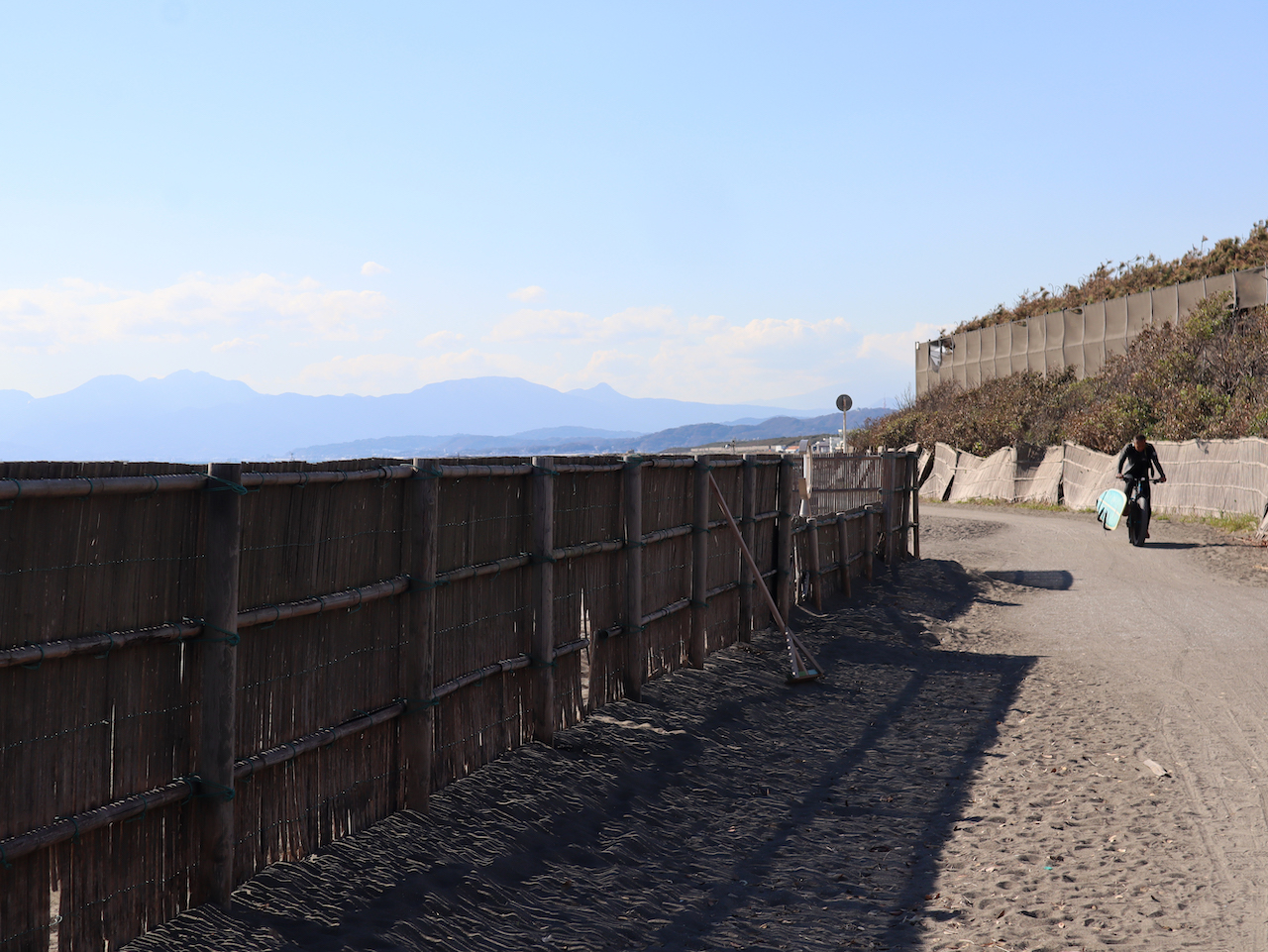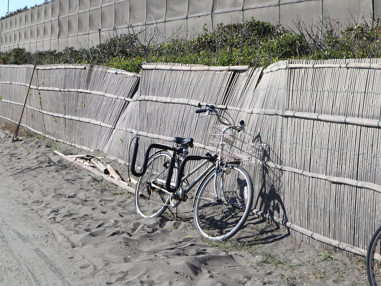 そんな海岸を歩いていると、前からサーフボードを自転車に積んだ人が。