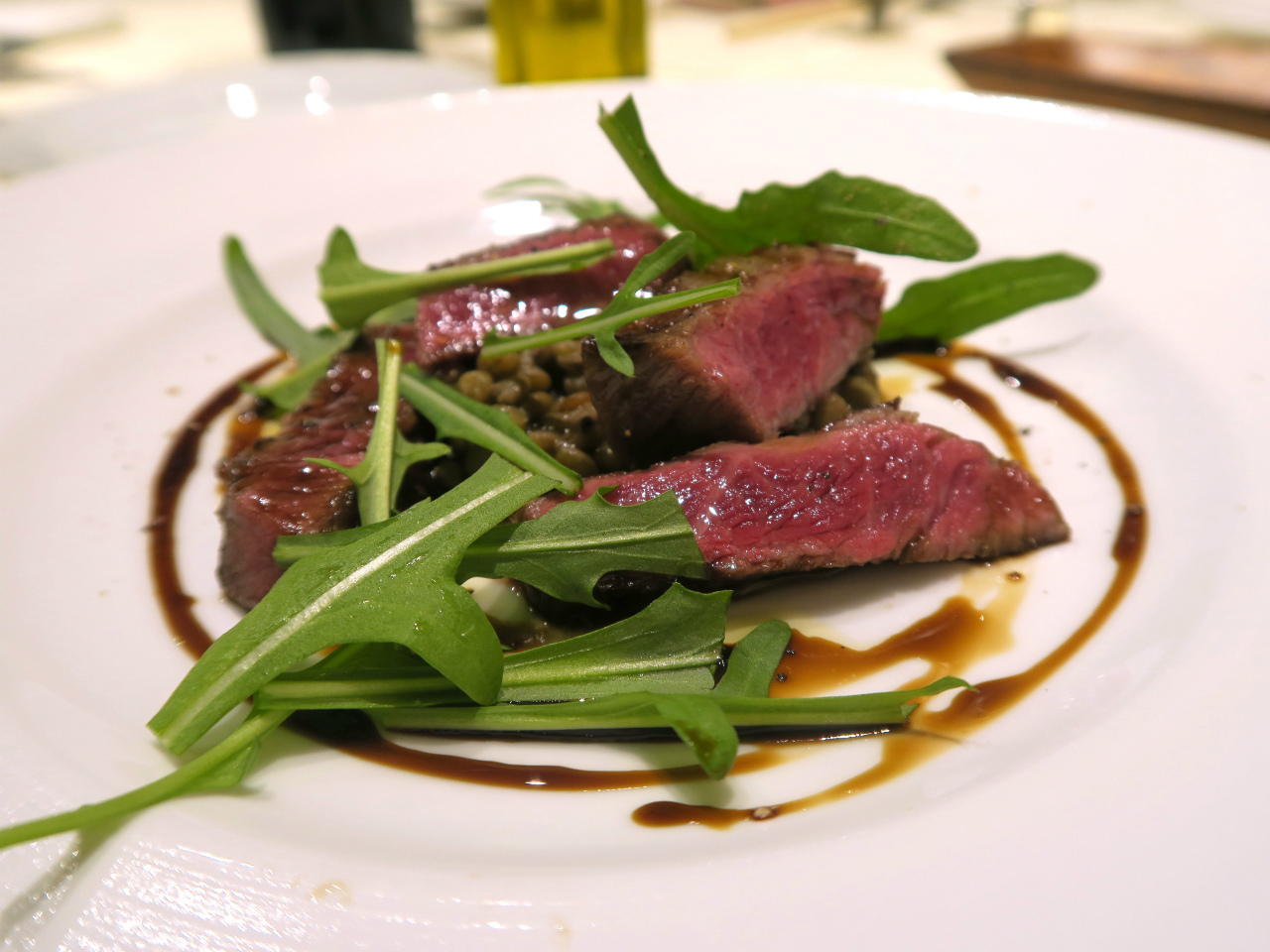 バルサミコを使ったソースに、レンズ豆が添えられています。