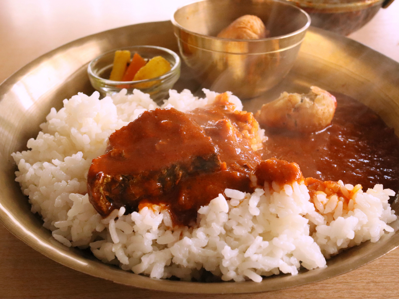 立派な器に盛られたカツオカレーと、アチャールにフライドモモ。