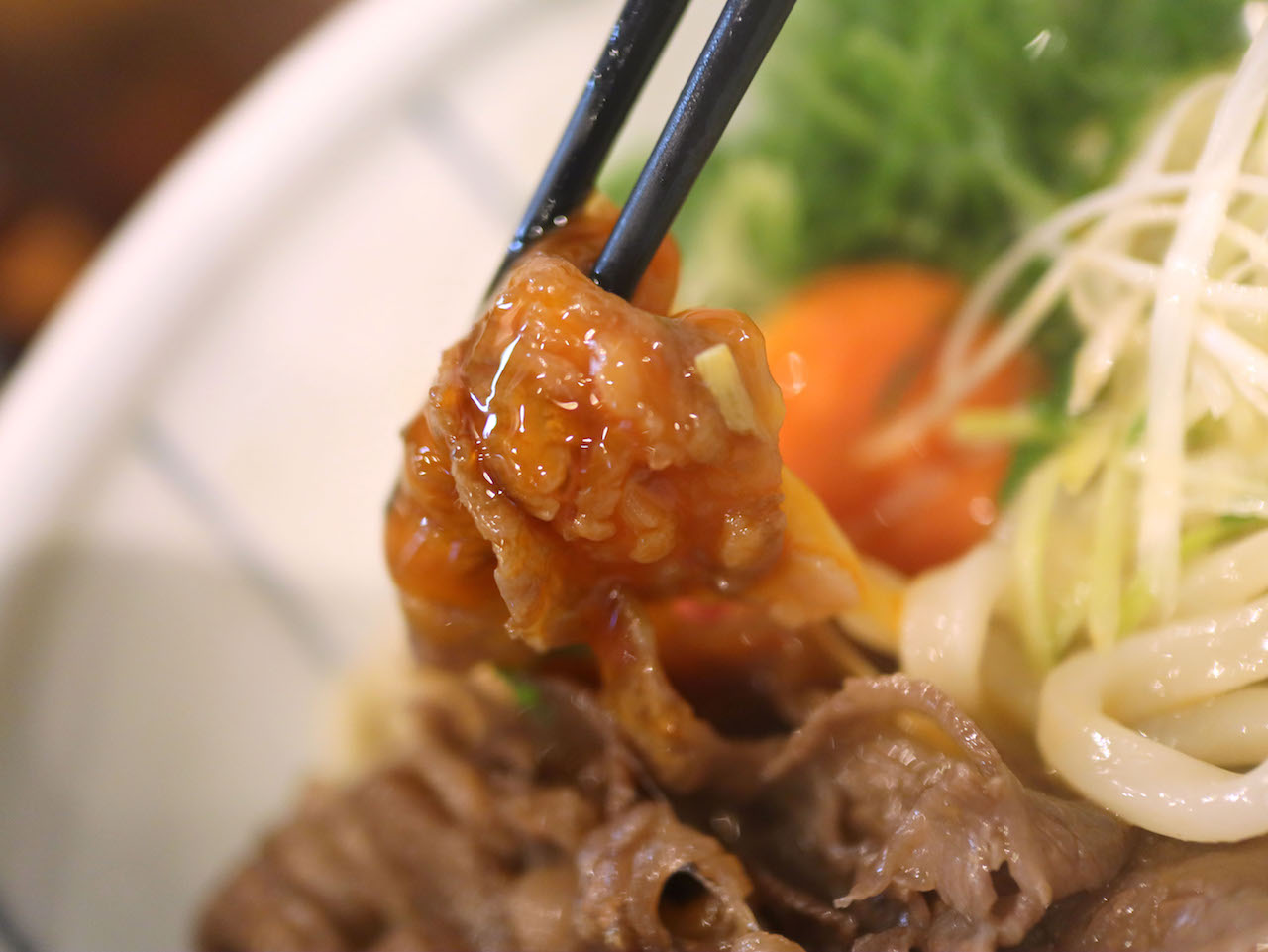 今度は肉と麺を絡めて、すき焼きのような風味でいただきましょう。