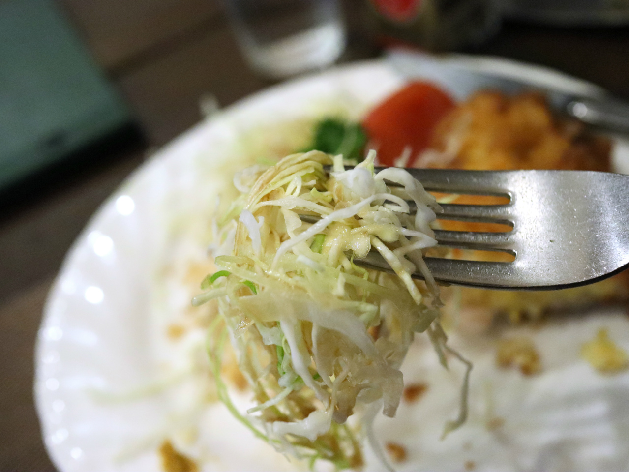 添えてあるキャベツにも、ウスターソースをちょっとかけていただきます。