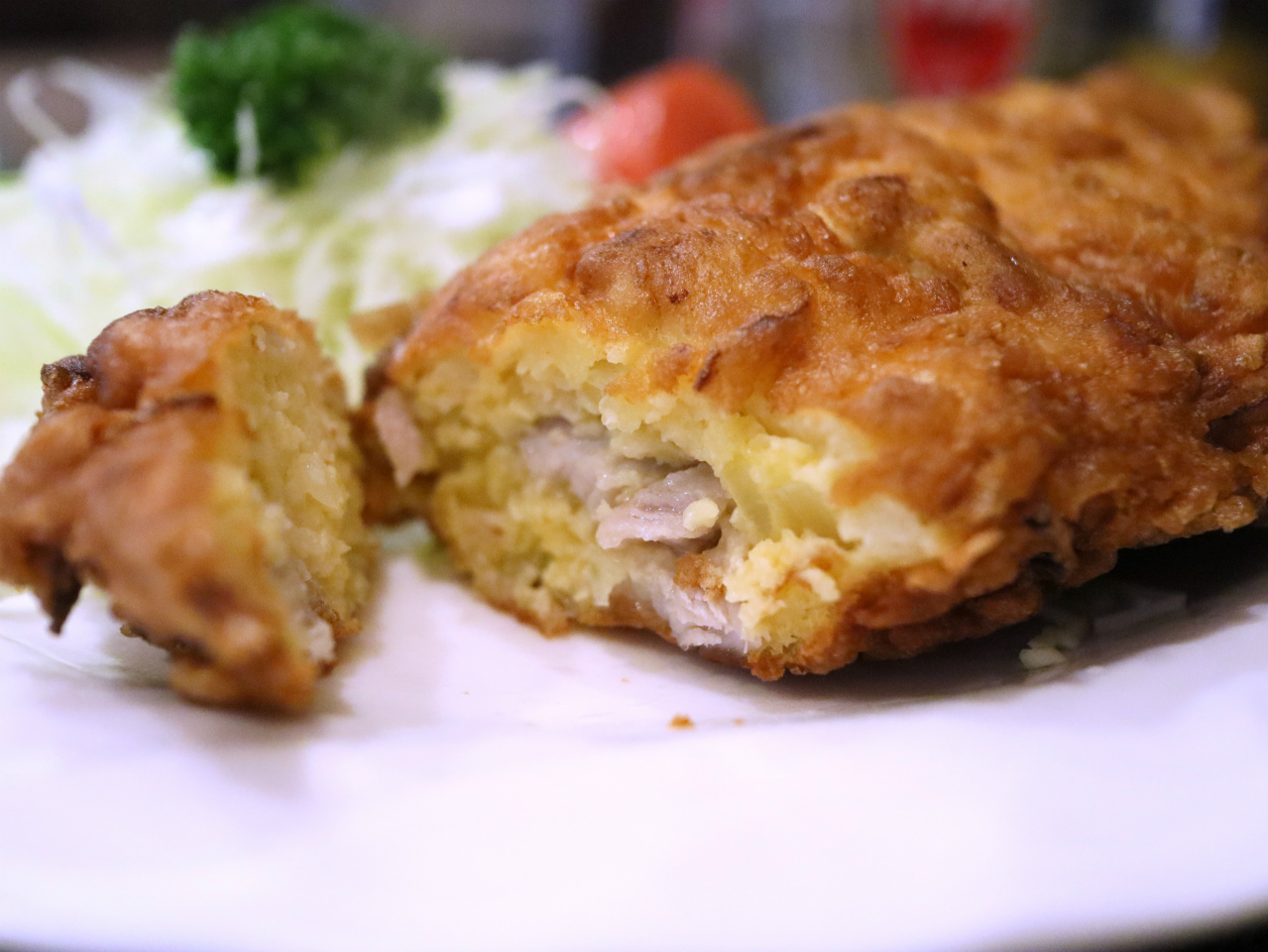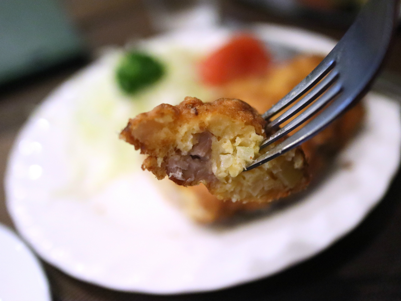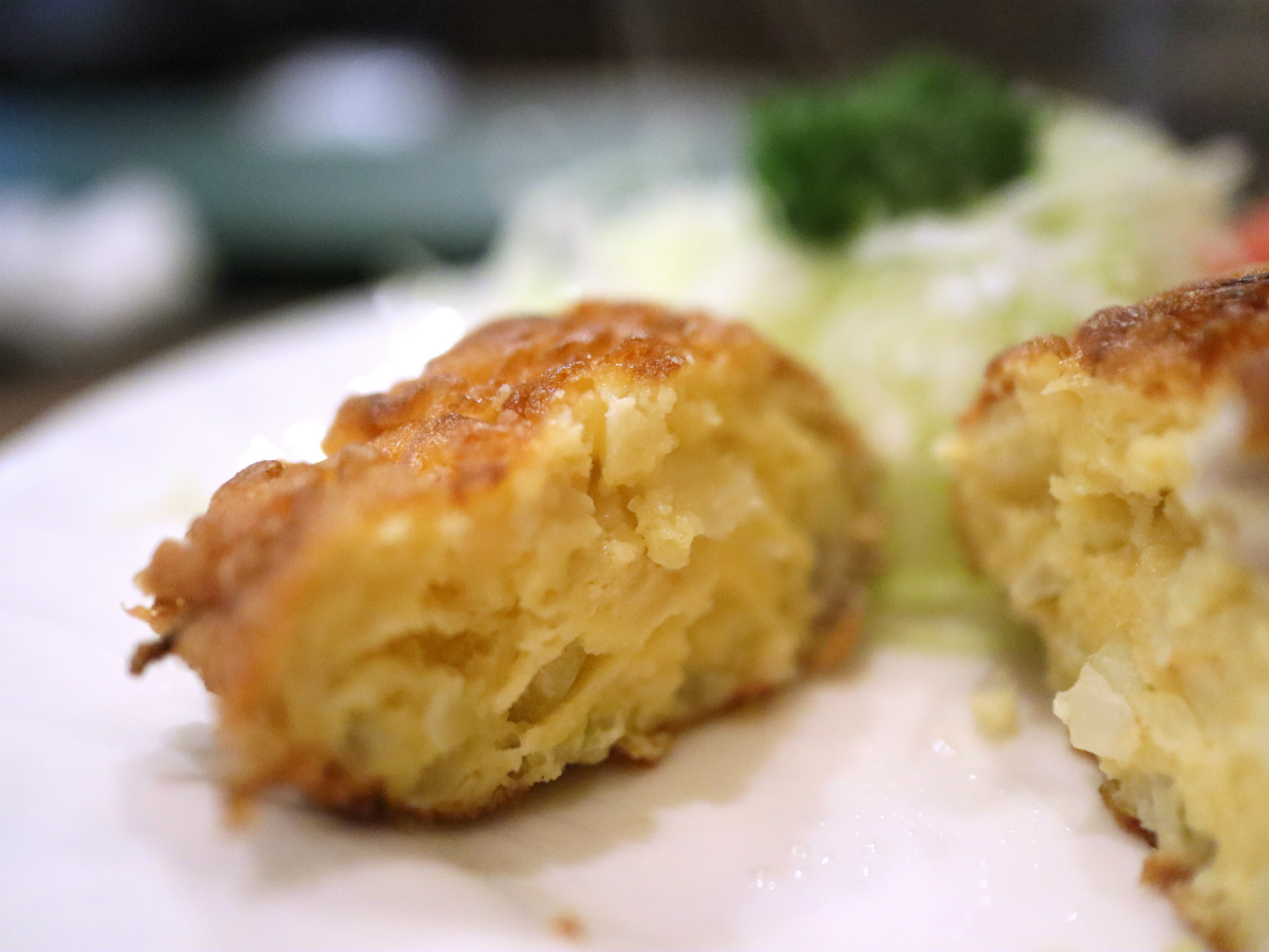 洋風かきあげは、一見オムレツをこんがりと揚げ焼きしたような感じ。
