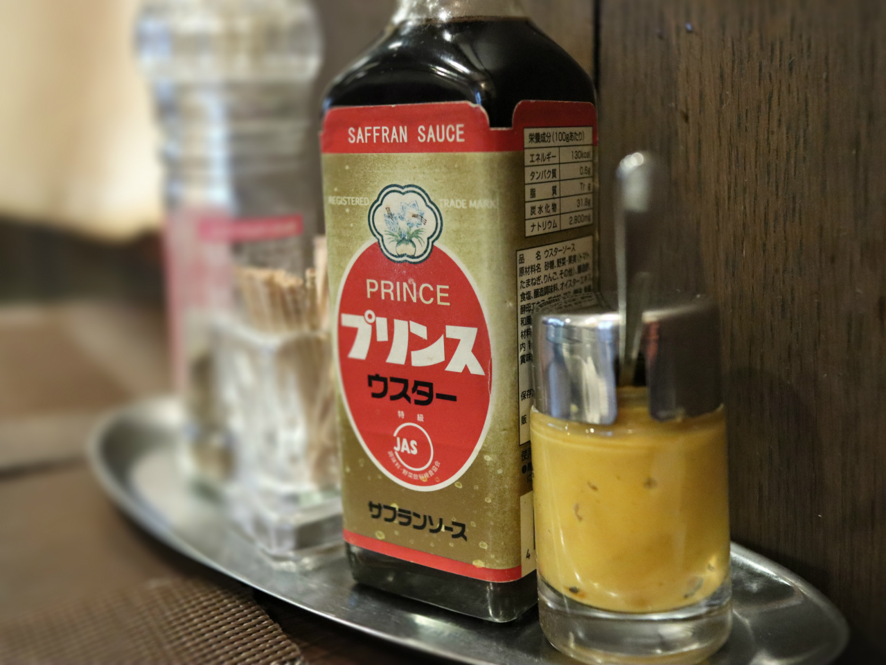 テーブルの上に置いてある、ウスターソースを軽くかけてみましょう。
