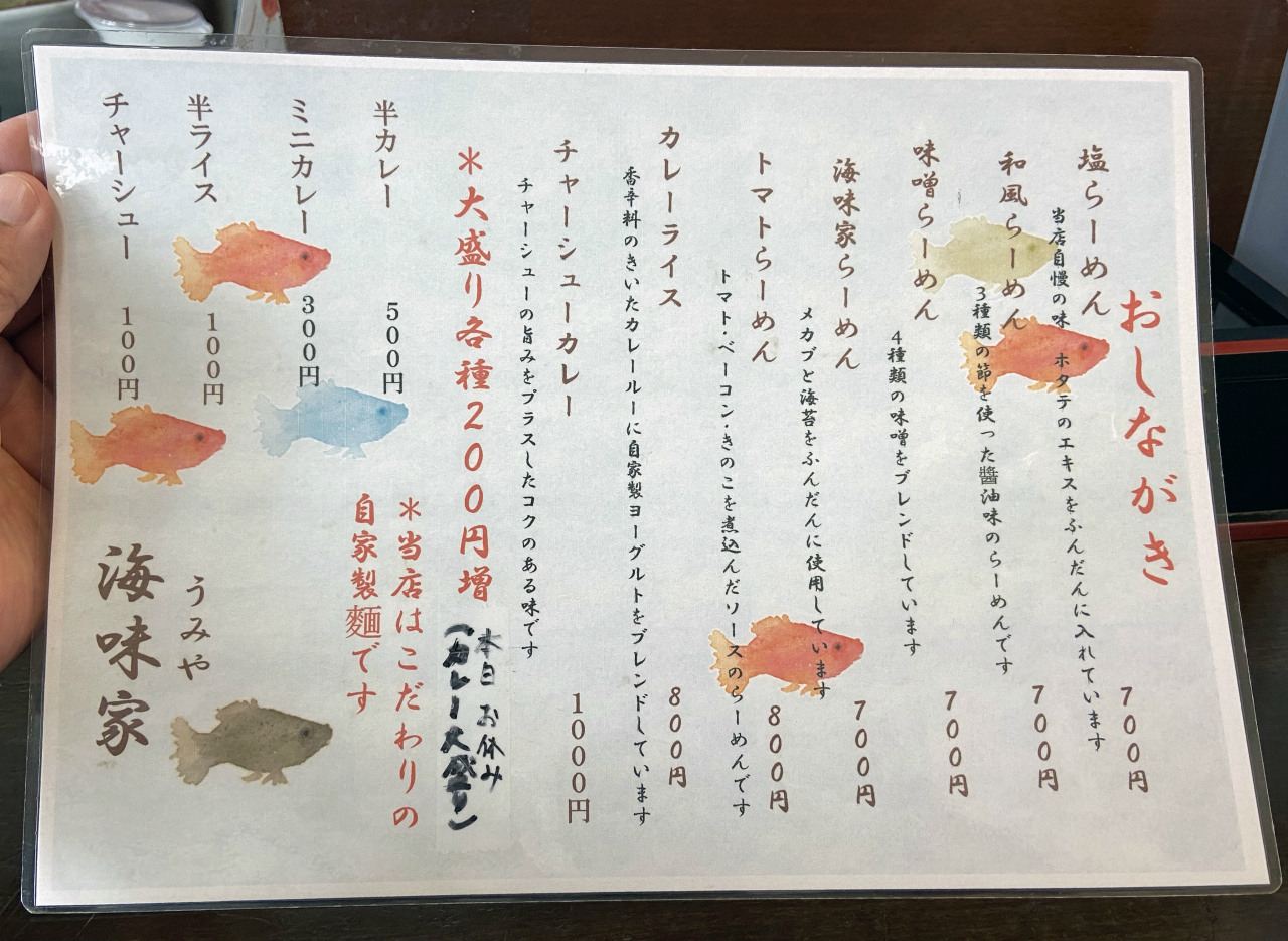 「おしながき」を見ても、塩らーめんを筆頭に、和風らーめん、味噌らーめん……