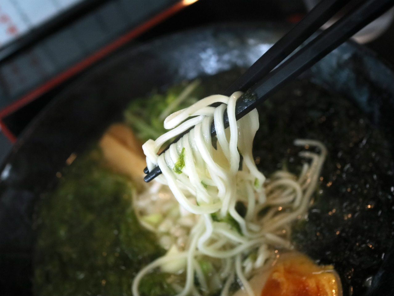 細めでコシのある麺は海苔、メカブ、そしてスープとよく絡み、いくらでもスルスルと入っていきます。