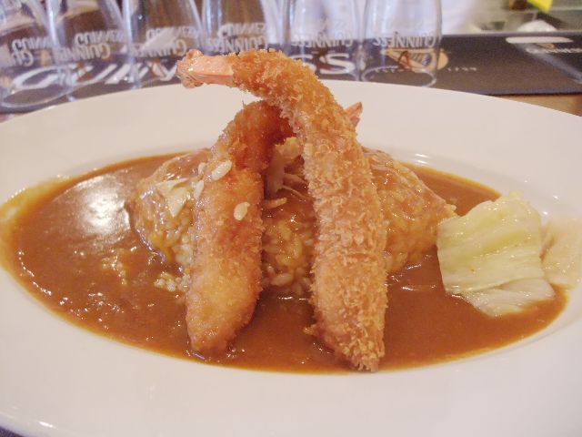 あとは香草でマリネした大きなエビをビールの衣でカリッと揚げたエビフライがのっている、アイリッシュ シュリンプカレー