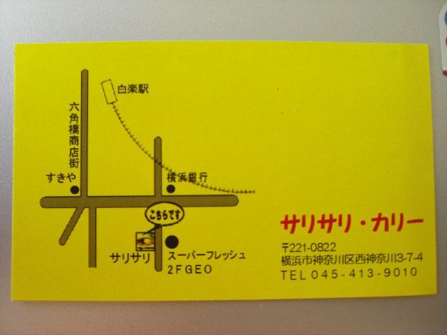 はい、ここは東急東横線、白楽駅から徒歩5分くらいのところ、神奈川大学のすぐ近くにある、パキスタンカリーの店、サリサリさんです。横浜線、菊名駅から各駅停車に乗り換えて、2駅目。横浜駅からも3駅目の抜群のロケーションにあります。