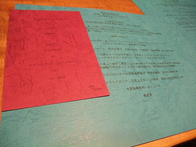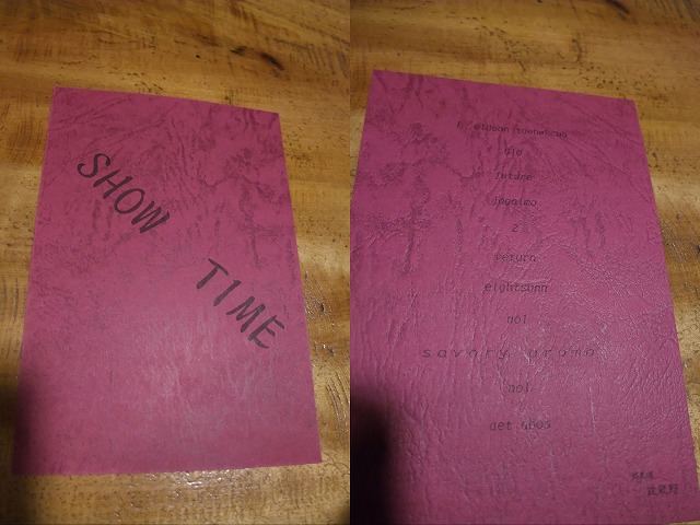 いつもなら、テーブルの上の今月の蕎麦会のメニューがおいてあるのですが、今月はメニューの代わりに“SHOW TIME”とかかれた紙がおいてありました。そして、裏側にはなにやら暗号のようなものが・・・