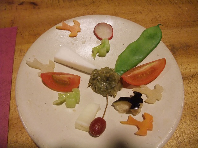 河南の人参、大根、二十日大根、胡瓜、茄子のピクルスは鳥の形にくりぬいてあります。時計の針にみたてられた、秋田長芋、愛媛沢庵、グミとモロッコインゲン。イタリアントマトとアイコ。そして、真ん中には石川の山椒の葉を山椒のすりこぎですりおろし、白味噌をあえた山椒味噌が盛ってあります。綺麗すぎて、食べてしまうのがもったいないですね。