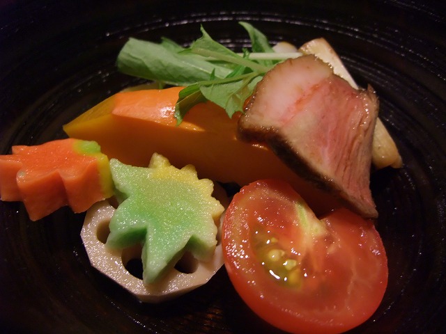 そして、これは毛馬胡瓜とコリンキーとズッキーニとトマト、仙台白葱に徳島蓮根、加賀太胡瓜と京水菜、但馬の鴨ロースに生麩です。