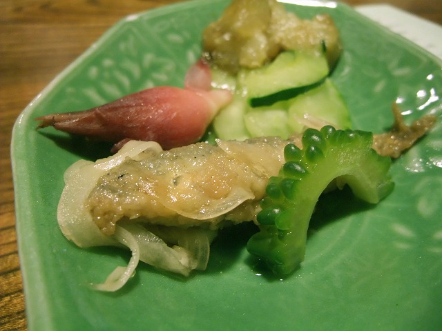 天然小鮎の南蛮漬けと新小茗荷の甘酢漬け、黒瓜と苦瓜に焼き茄子です。