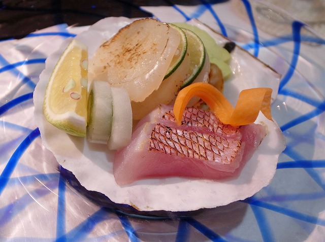 ホタテ、金目鯛の焼霜を酢橘でいただきます。