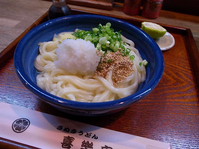 茹でたてのうどんに大根おろしとネギと胡麻。