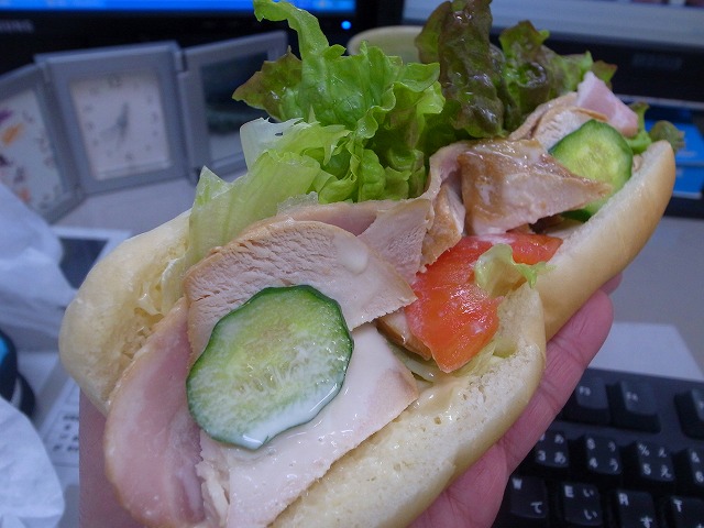 こちらは、細長いパンに鶏むね肉、厚切りのベーコン。