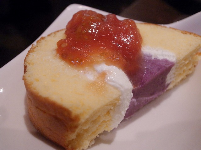 紫芋のロールケーキにトマトのソースがかけてあります。