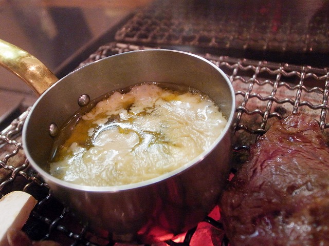 炭火の上で、肉と一緒に温められている金属の容器・・・。