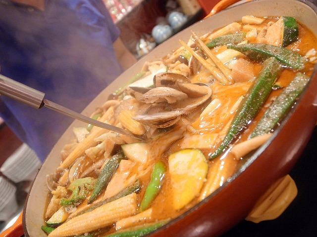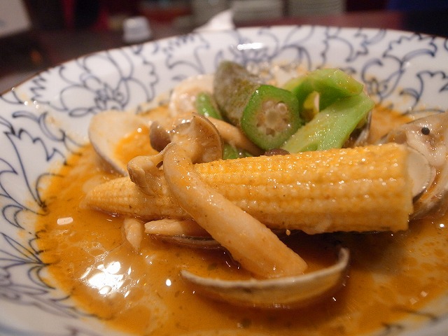 活ハマグリのグリーンカレーです。ハマグリ、オクラ、かぼちゃ、ヤングコーン、ブロッコリー・・・。