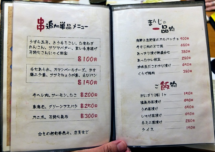 好きな串を単品で追加することも出来ますし、一品料理のメニューもいろいろありますよ。