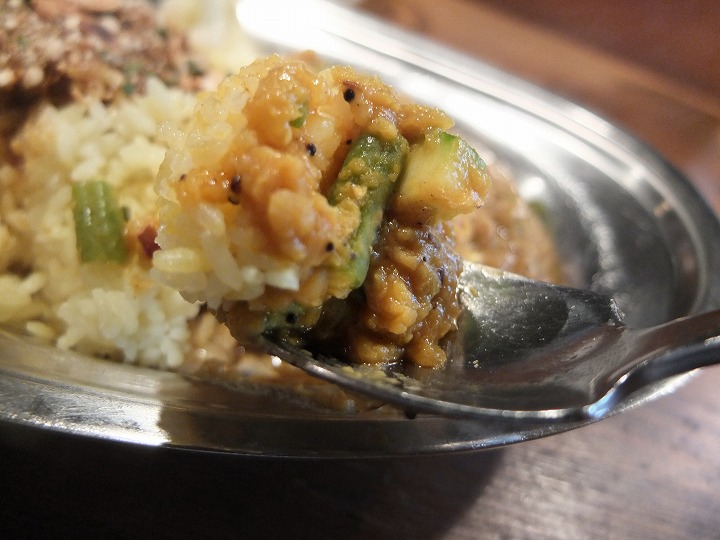 そして、残り1/3位くらいになったところで、辛口のキーマカリー、マイルドな豆カリーを混ぜていただきます。