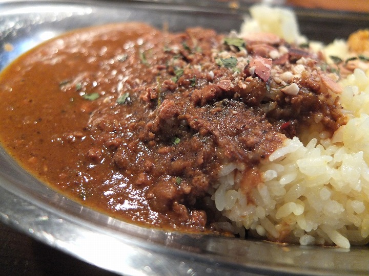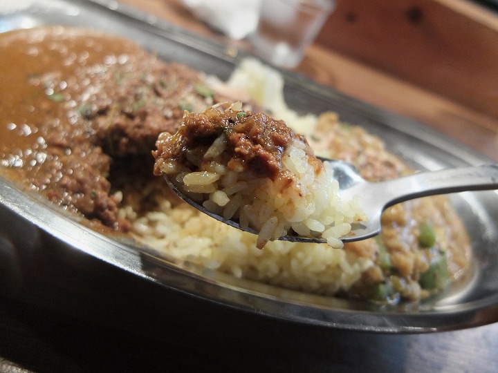 大きめのステンレス製のお皿に入って提供されるカレーは、スパイス感たっぷりな感じが見ているだけでも感じ取れますね。