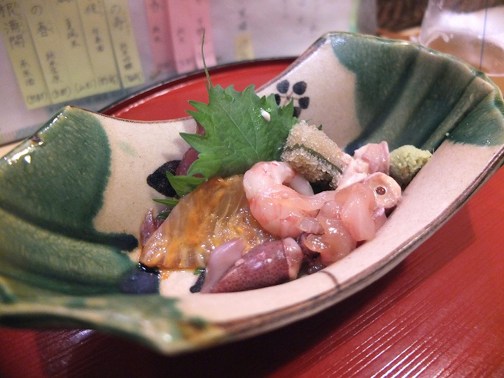 かつお生姜醤油和え、ホタルイカ、白身魚、甘エビの酒盗和え、子持ち昆布、ミズタコ 、