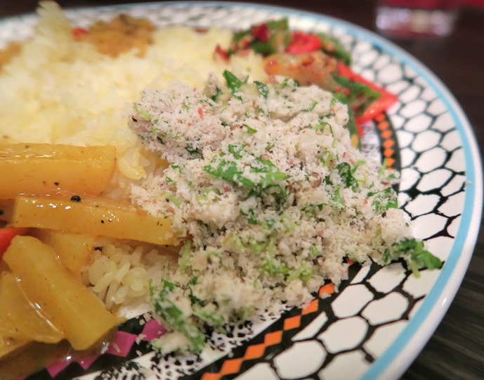 それぞれを味わったあとは、器に入ってるフィッシュカレーをプレートの上にかけていただきます。