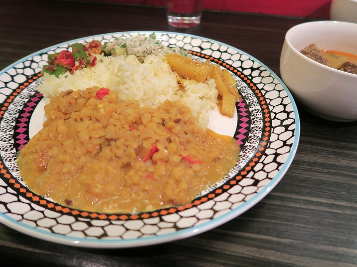 手前にタップリのレンズ豆のカレー、そしてまわりをいろんなおかずが綺麗な彩りで飾られていますね(^^)