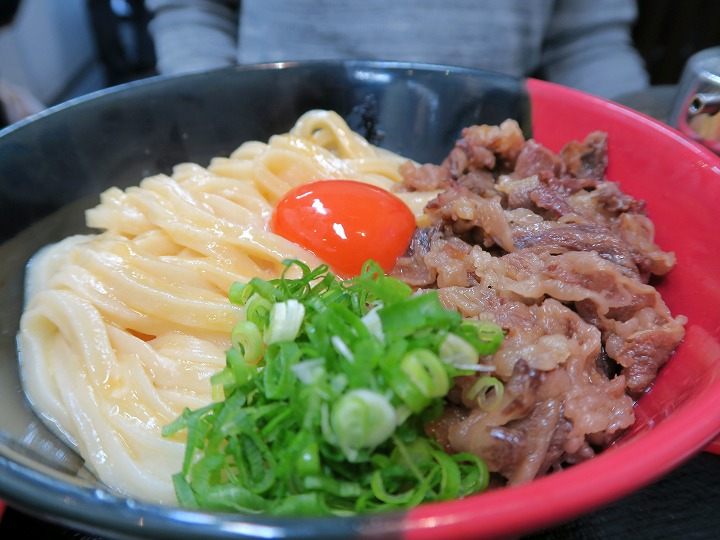 さらに、甘辛く炊いた黒毛和牛と、こだわり玉子の「蘭王」の黄味がのっかって、これはかなり贅沢なうどんですよ(^^)