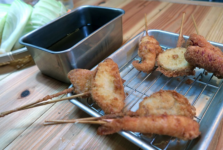 さて、やはり最初は大阪の定番メニュー、串カツの盛り合わせからいただきます。