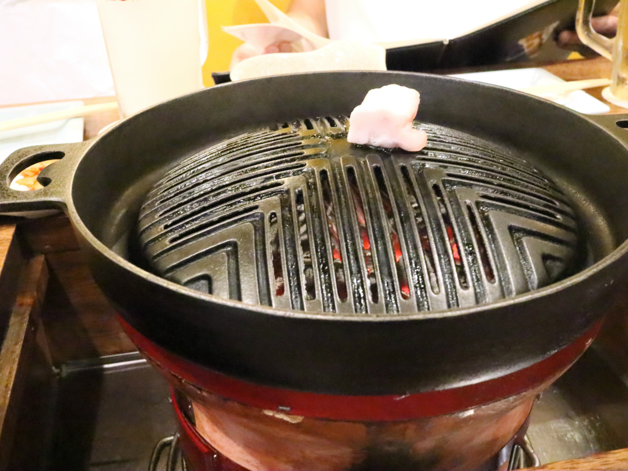 ジンギスカンを注文すると、テーブルに炭火のコンロがセットされます。