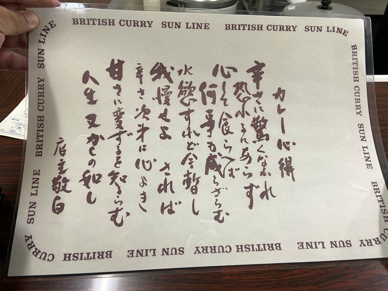 カウンターの上には、カレーの説明が書かれたハガキのようなものがあります。