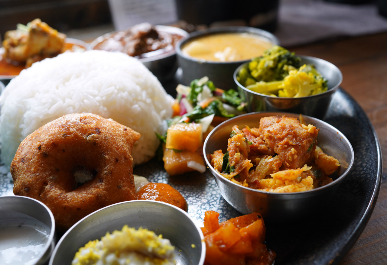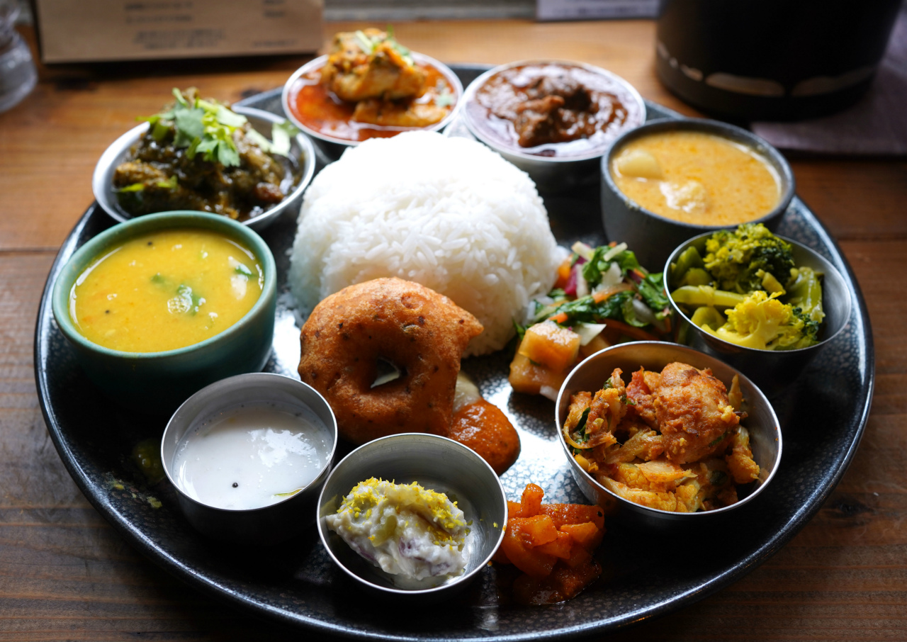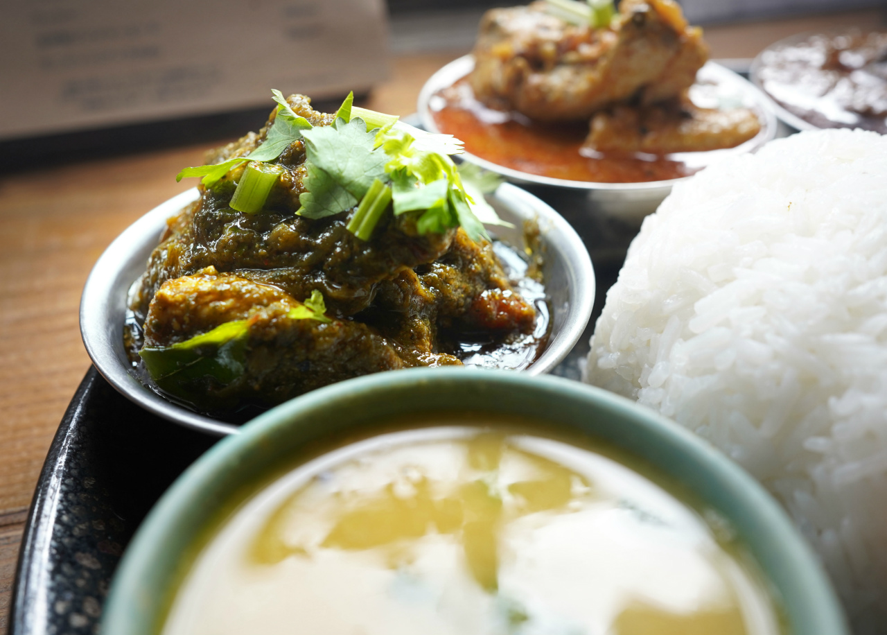 4種類のカレーと、9種類の副菜、スープ、アチャールなど。