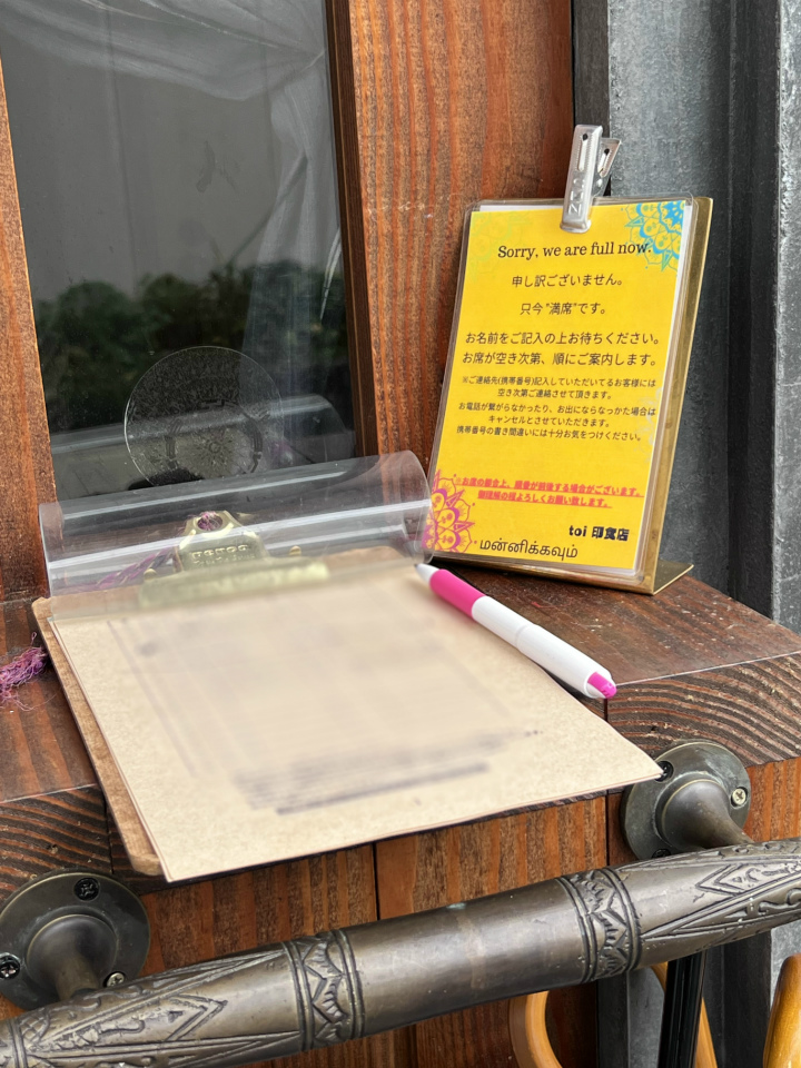 店に到着して満席ならば、このような感じで記帳表が置いてあるので、ここに名前を書いてから席が空くのを待つように。