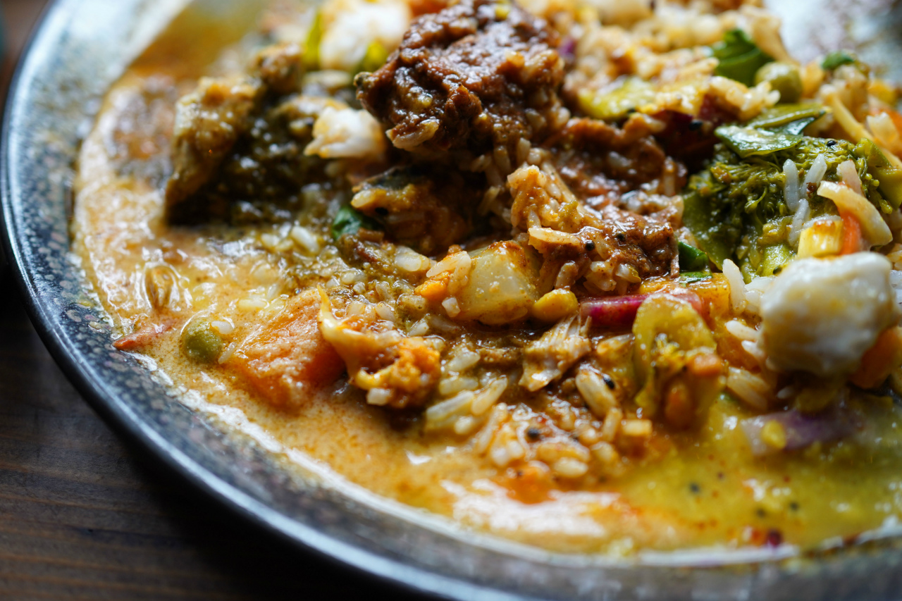 後半はすべてのカレー、副菜、アチャールを混ぜて複雑に変化する旨味を楽しむのが正解。