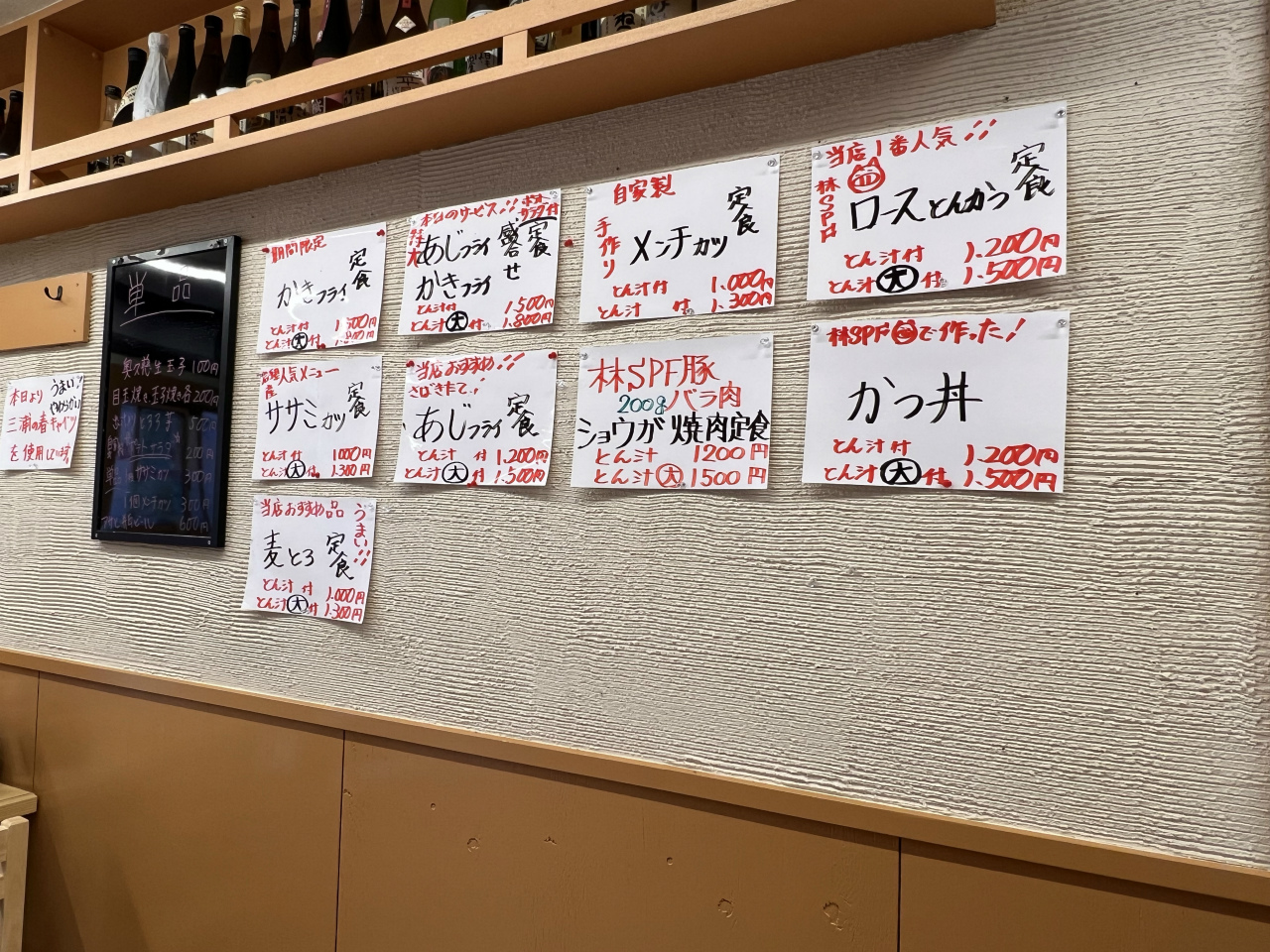 檍と言えば…の「ロースとんかつ定食」はもちろん、「かつ丼」、「メンチカツ定食」、「ショウガ焼肉定食」、「かきフライ定食」なども揃い、JR蒲田駅前の『まるやま食堂』を思い出させる。