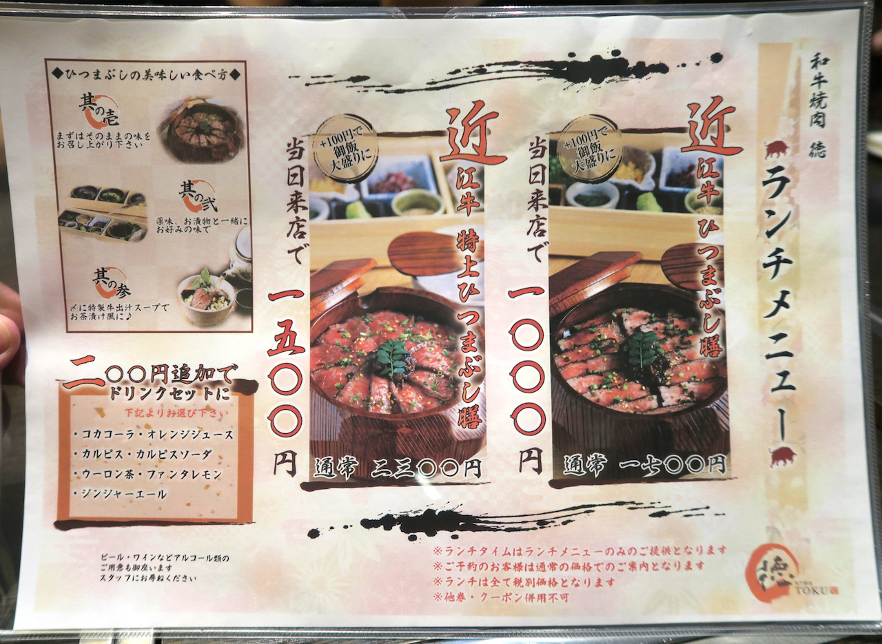ランチ営業開始から3日間は、近江牛のひつまぶし2種類のみの提供です。