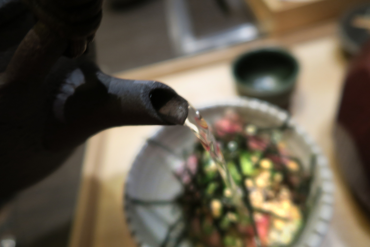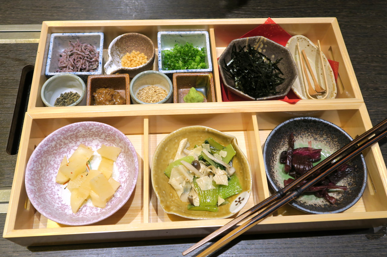 そんな感じで、少し店内を見せてもらっていると、先にお漬物と薬味が運ばれてきました。