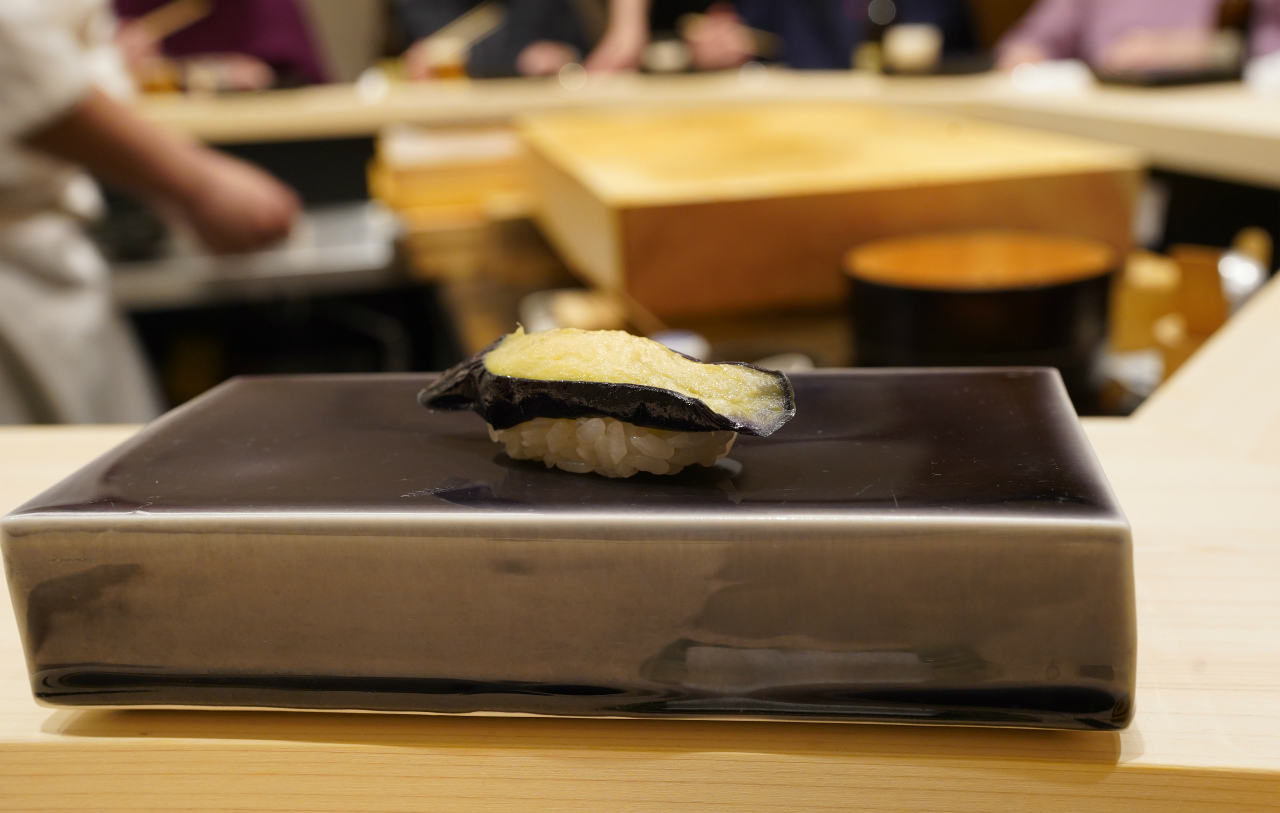 それは、ひとくち食べれば分かる、茄子の揚げ物と鮨のさっぱりした味わいがびっくりするほどよく合うのだ。