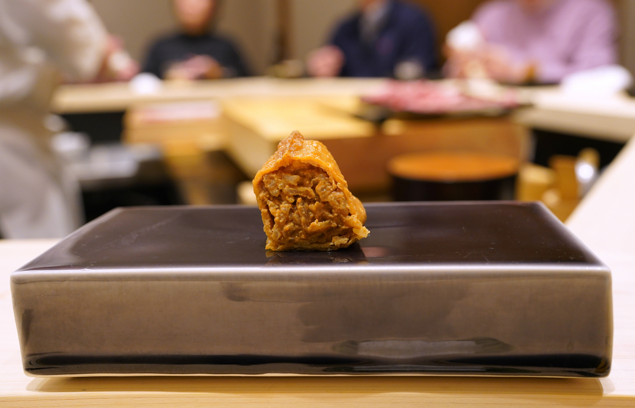 藤田水産のマグロ…赤身と中トロのすり身を太巻きにしたもので、今まで食べたことがないようなマグロの旨味の世界がギッシリと詰まった一品。