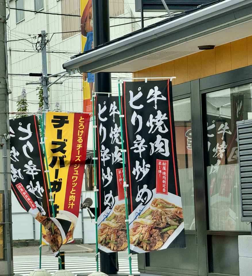 「牛焼肉ピリ辛炒め」の幟に紛れて黄色い幟が1本。