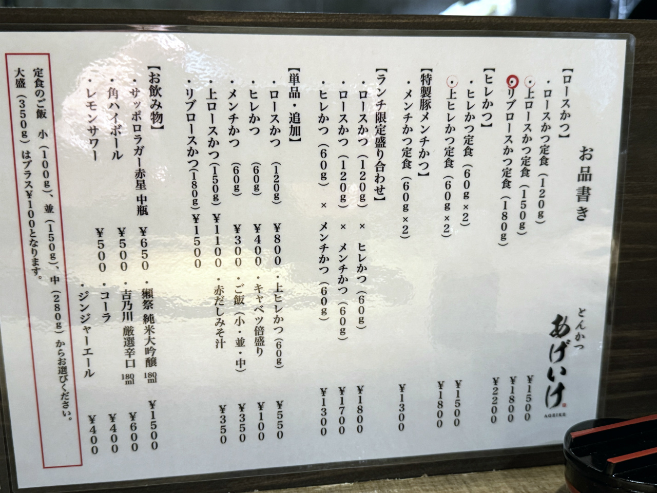 いろいろある中から『リブロースかつ定食(ご飯並)』と、単品で『上ヒレかつ』を追加してみた。