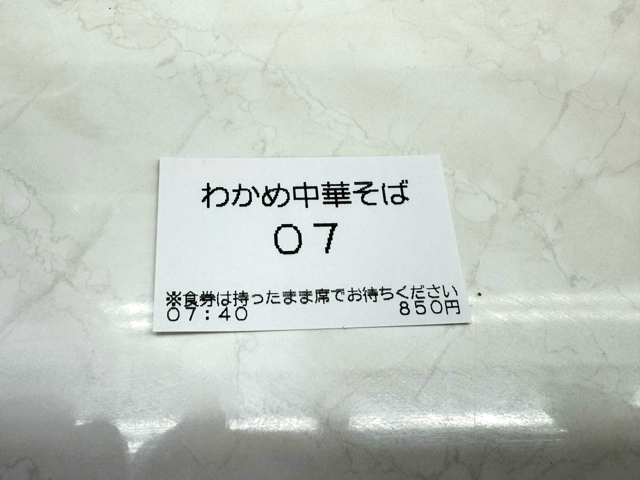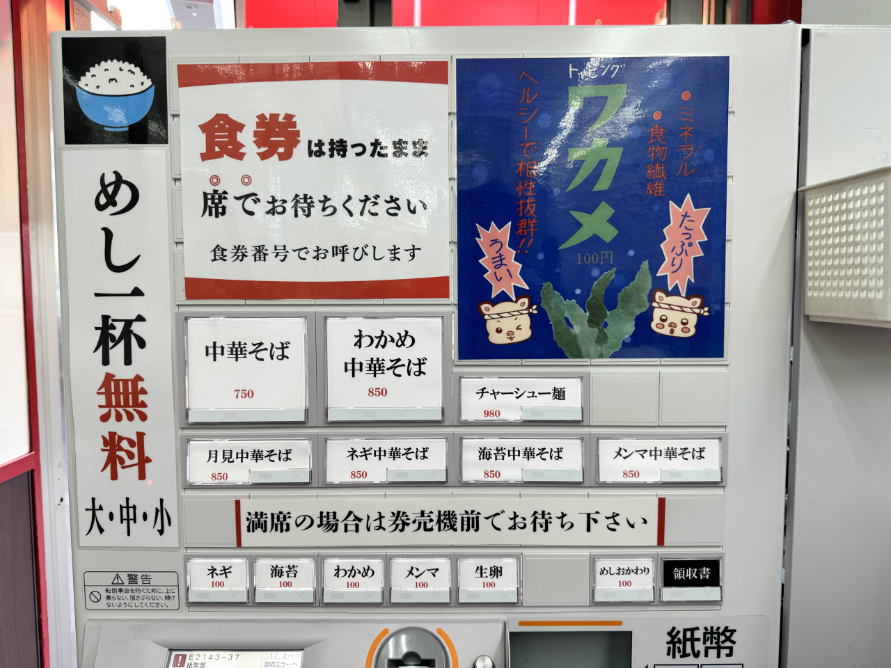 券売機を見てわかめ推しのように感じたので『わかめ中華そば』の食券を購入した。