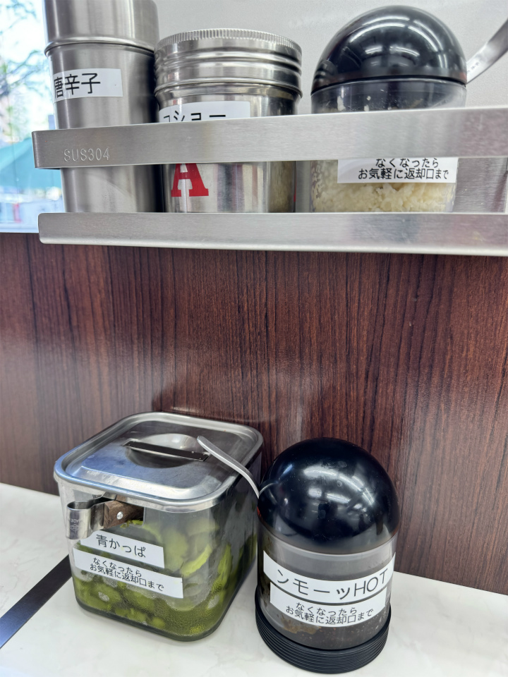 唐辛子、コショー、ニンニク、ンモーッHOT(秘密兵器だろうか?)、青かっぱは眼の前においてあるのでお好みでどうぞ。
