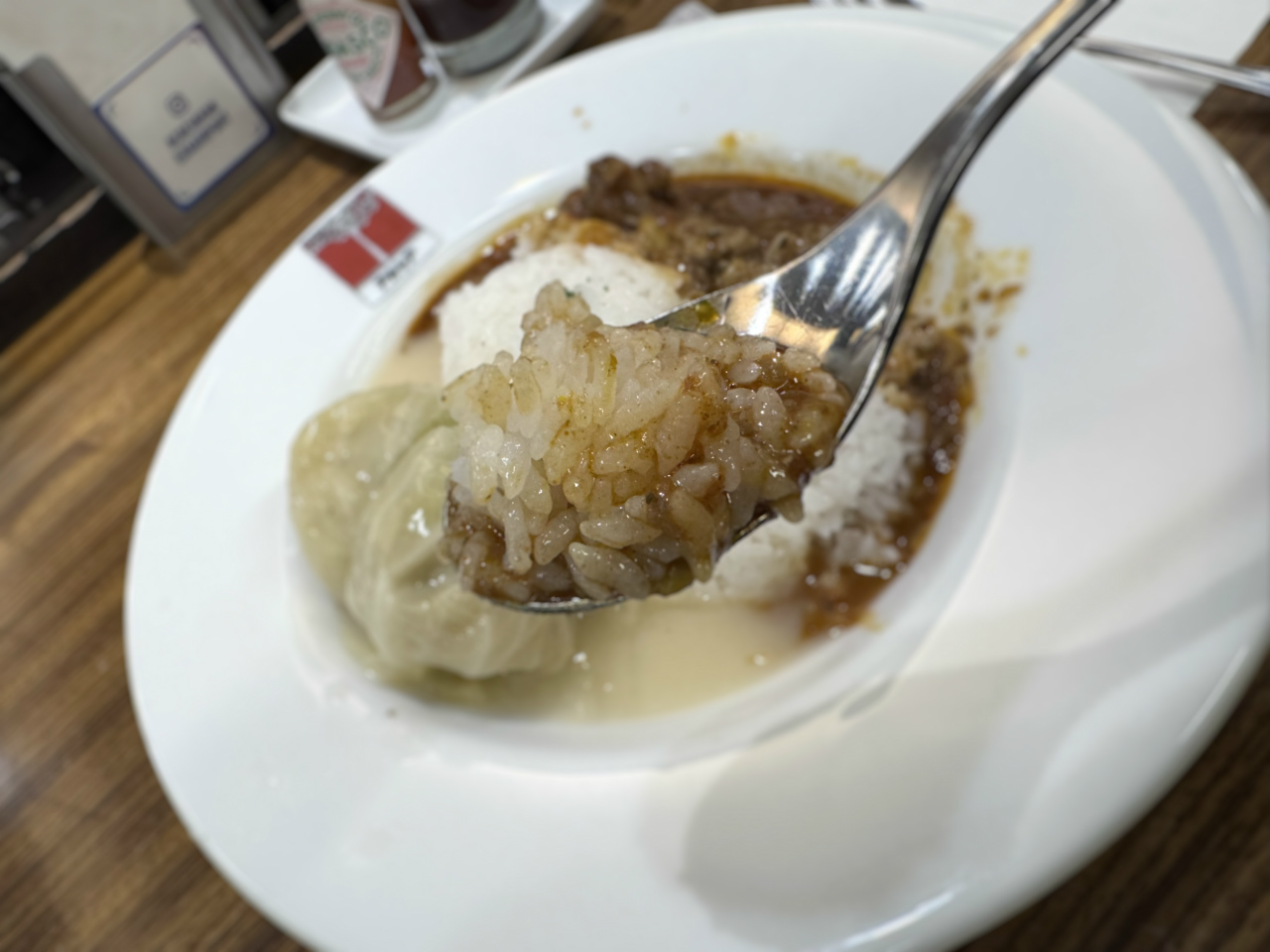 その間を取って、カレーを半分ライスの上にかけてみた。