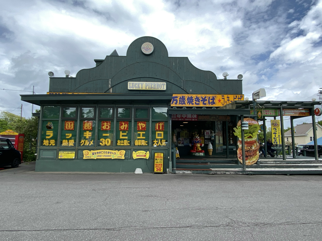 「函館おみやげ」、「万歳やきそば」「ラッキーピザ」の文字は確認できるものの、ハンバーガーと書かれた大きな文字の姿はない。