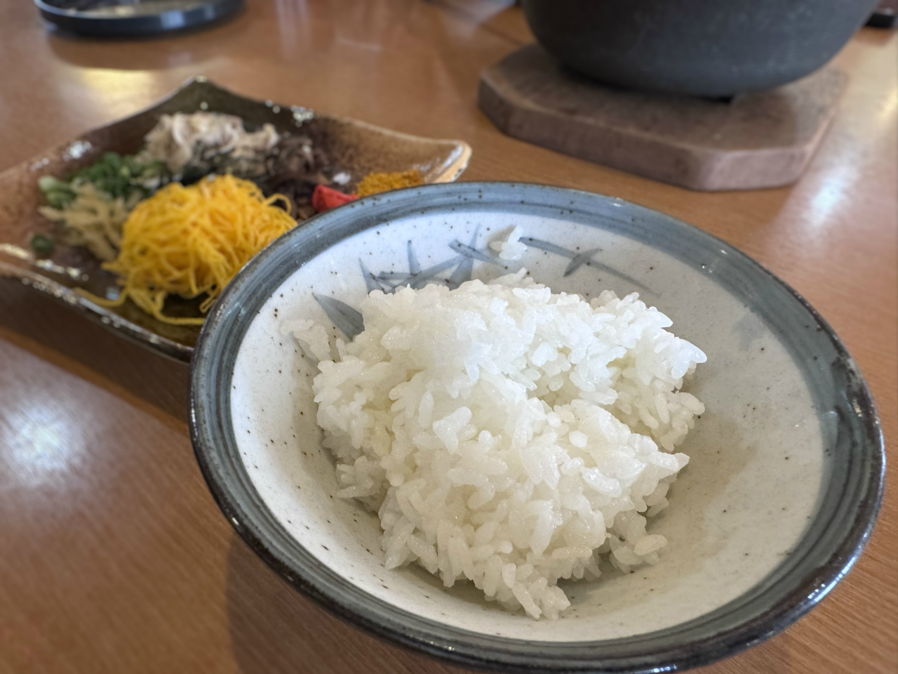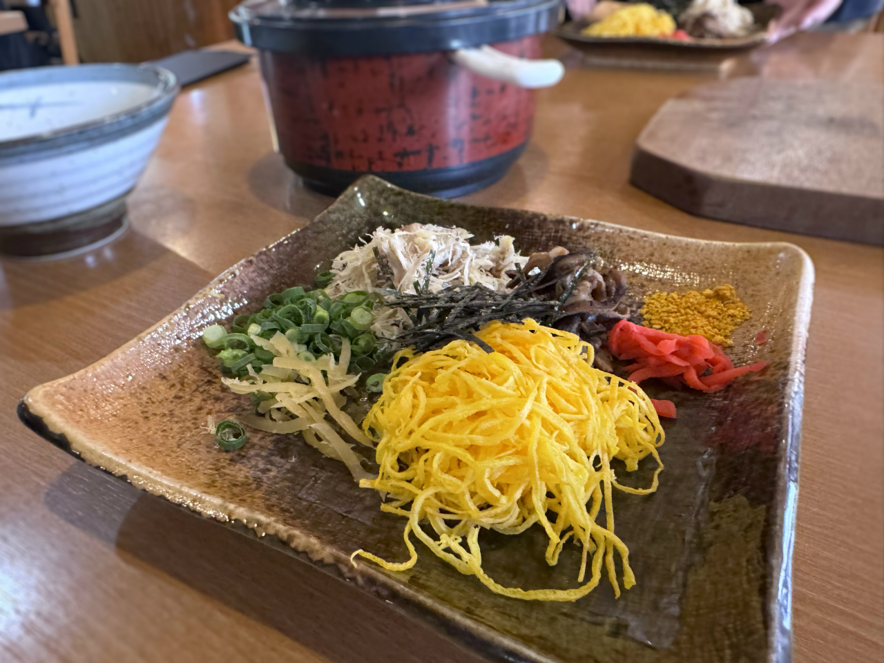 空の茶碗、おひつ、具材が乗っかった皿、そして熱々の出汁が続いて出てくる。